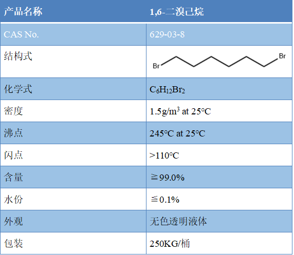 1,6-二溴己烷(化学式:C₆H₁₂Br₂,CAS号:629-03-8)是一种有机化合物,分子量为243.97,外观为无色液体。1,6-二溴己烷不溶于水,可溶于乙醚、苯、氯仿和乙醇等有机溶剂。