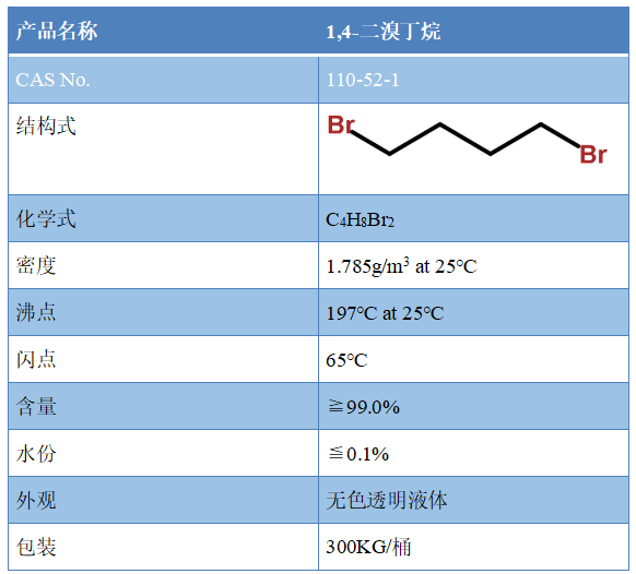 1,4-二溴丁烷是一种无色或微黄色液体, CAS 110-52-1,溶于氯仿、醇和醚,不溶于水。1,4-二溴丁烷主要用于制备氨茶碱、咳必清、驱蛲净等。