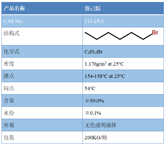 溴己烷(1-Bromohexane),又称为正己基溴、1-溴己烷,是一种卤代烃,CAS 111-25-1。 其外观为无色或淡黄色的液体,有刺激性的气味,不溶于水,溶于乙醇、乙醚和酯。 溴己烷可由正己醇与三溴化磷经取代反应制得,也可采用氢溴酸法制得。用途方面,除了可作为有机合成中间体,溶剂之外,还是重要的有机精细化工产品原料和烷基化剂,可用作制备香料、液晶单体。