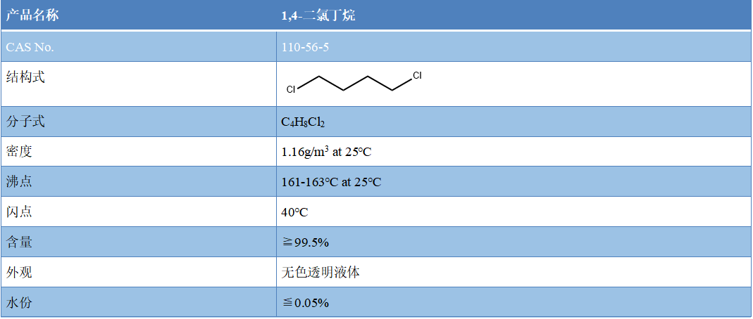 1,4-二氯丁烷(1,4-Dichlorobutane), CAS 110-56-5, 别名氯化四亚甲基。该物质为无色透明液体,具有温和气味,不溶于水,可溶于乙醇、乙醚等有机溶剂。该化合物主要用于有机合成中间体,可参与制备己二腈、药物咳必清等产品,同时作为工业溶剂使用。